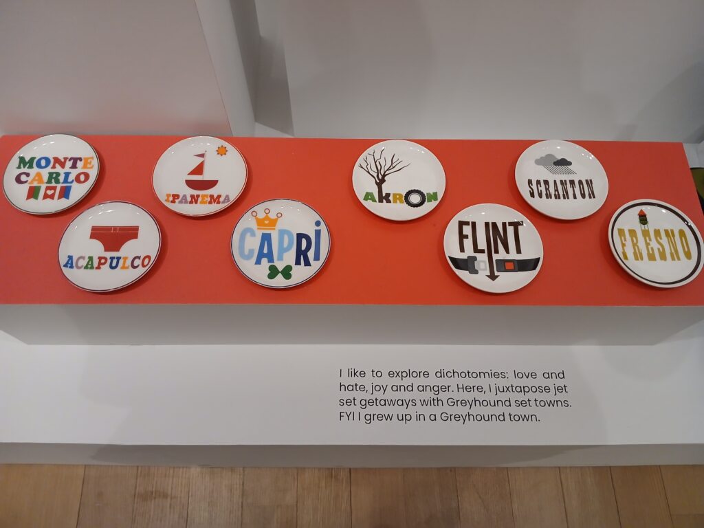 Funny small dishes showing both glamorous locations and less-glamorous locations, seen at the Jonathan Adler exhibit at MOAD. Copyright Deborah Abrams Kaplan