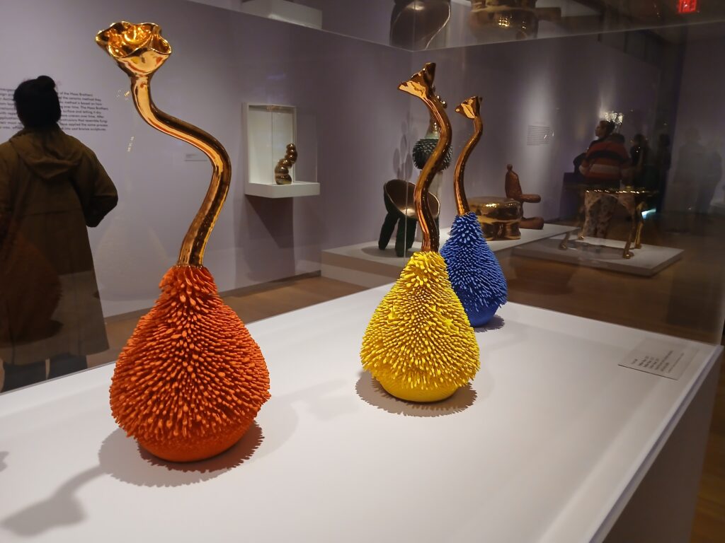 Uncanny Valley includes digital art as well, which you’ll see in the above photo. Below, on a different floor they have pottery that is made through “accretion” – made by layering on clay. Below are “father vases” made by hand-thrown pottery and porcelain, and brass plating.