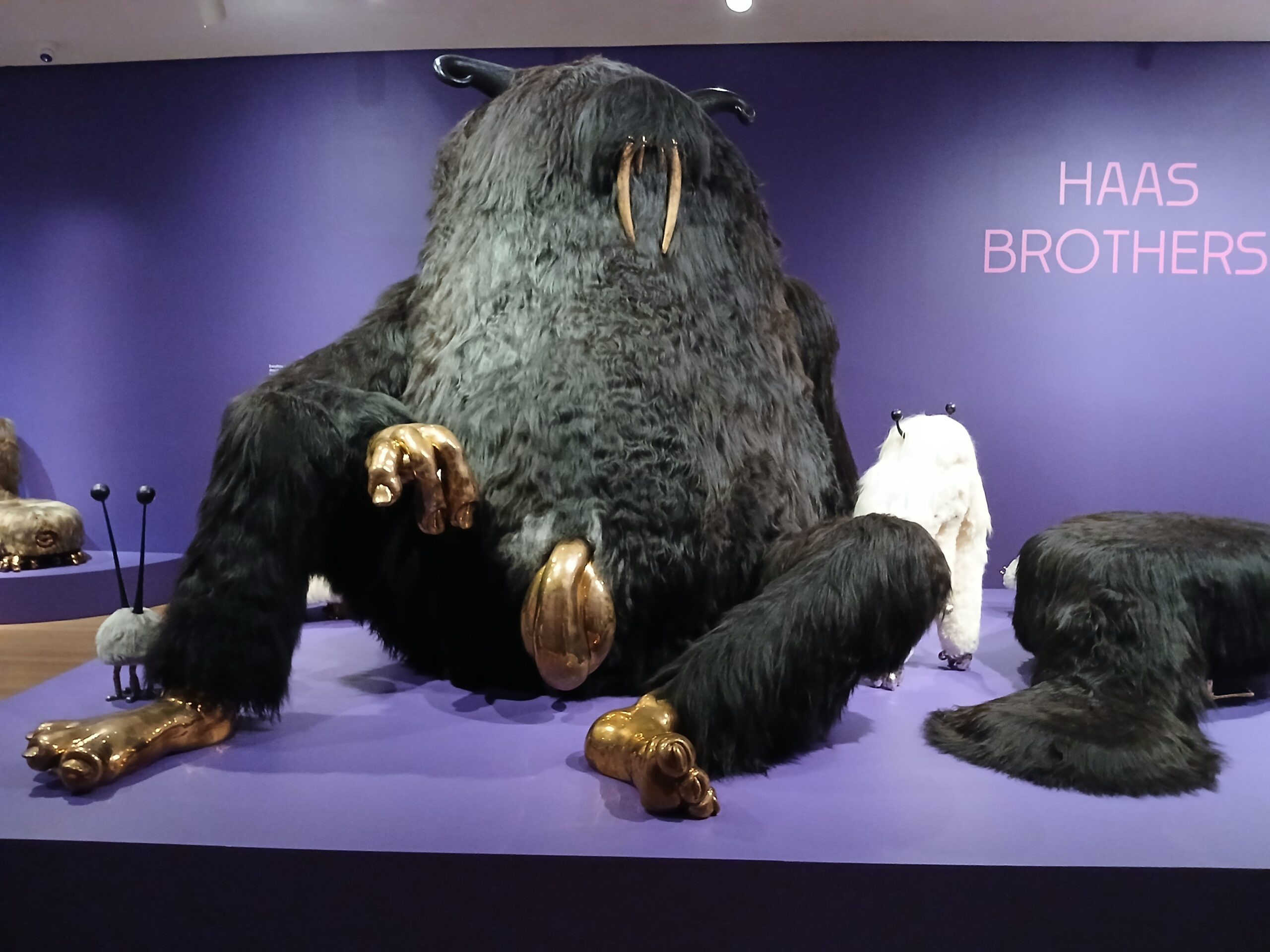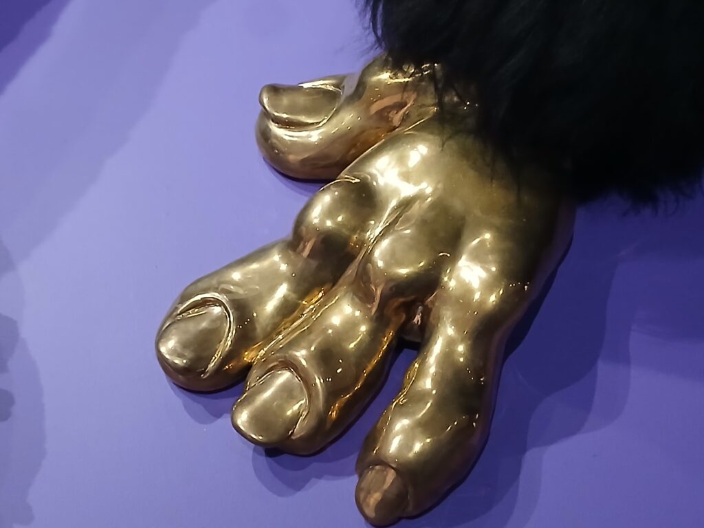 The exhibit featured a section of furry animals large and small. All look familiar but there is enough about them that is strange and different, that there’s no mistaking them for reality. The furry large black creature below is both giant and troll-like, with a walrus look. The feet/hands are a brass with digits and nails.