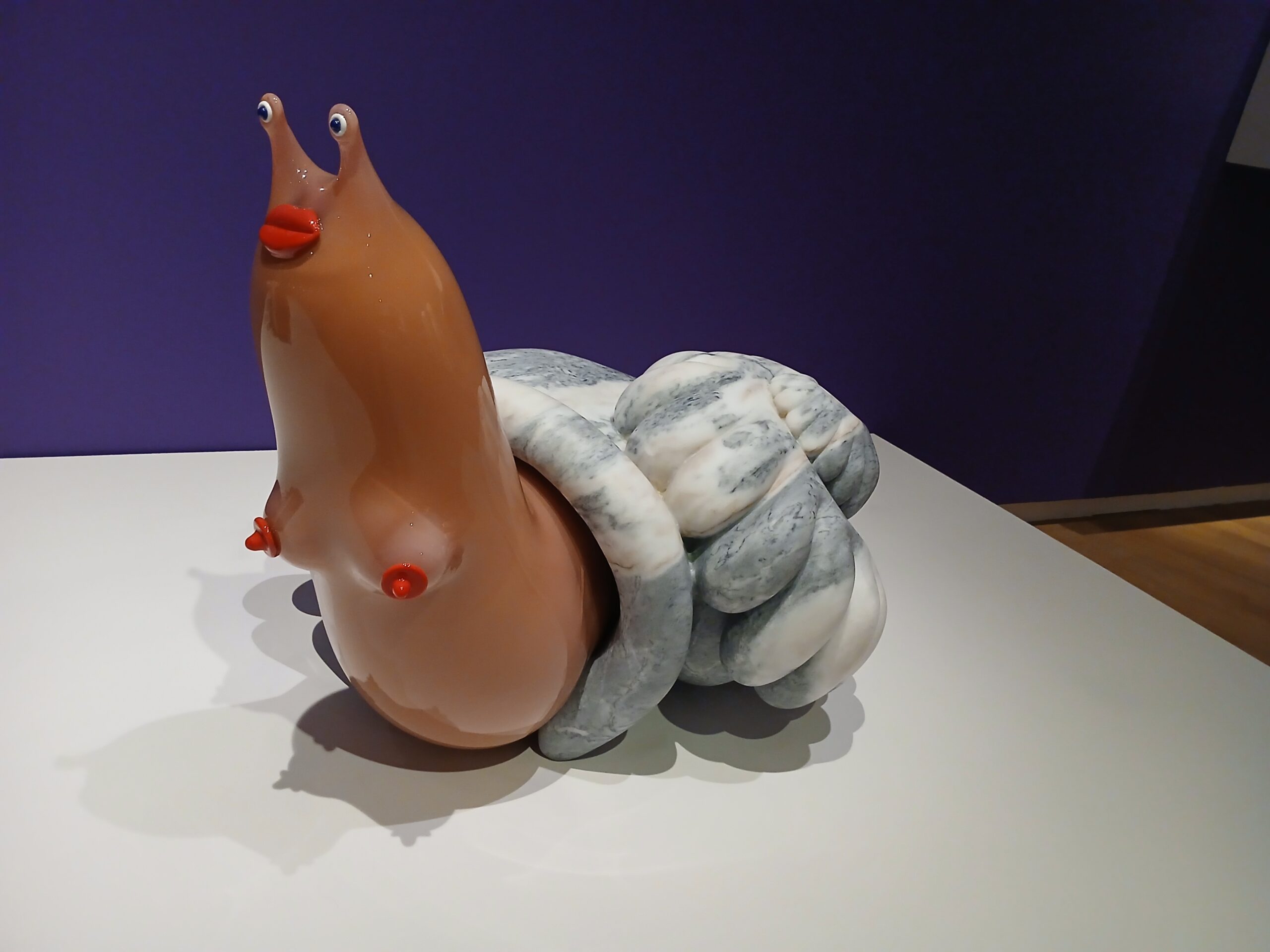 A blown-glass snail in a carved marble shell. Uncanny Valley by the Haas Brothers at MOAD. Copyright Deborah Abrams Kaplan